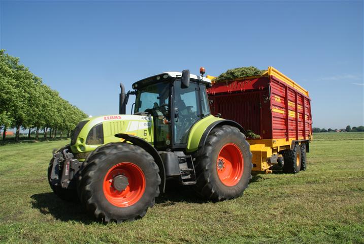 Claas Ares 836 RZ met een Breston haakarm carrier met silagebak.