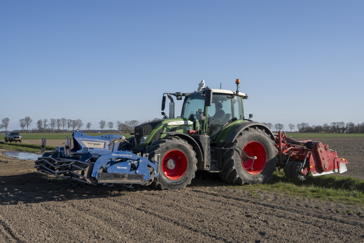 Een Fendt 724 Vario S4 maakt eerst ruggen. Voorin een VSS Agro Frontbedbereider en achter een 4,5m Grimme GF 600 hakenfrees.