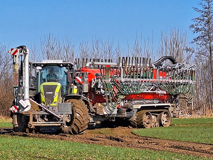 Claas Axion 960 Terra Trac met Wienhoff mesttank en 36m Vogelsang sleepslangboom van LU Marquardt.