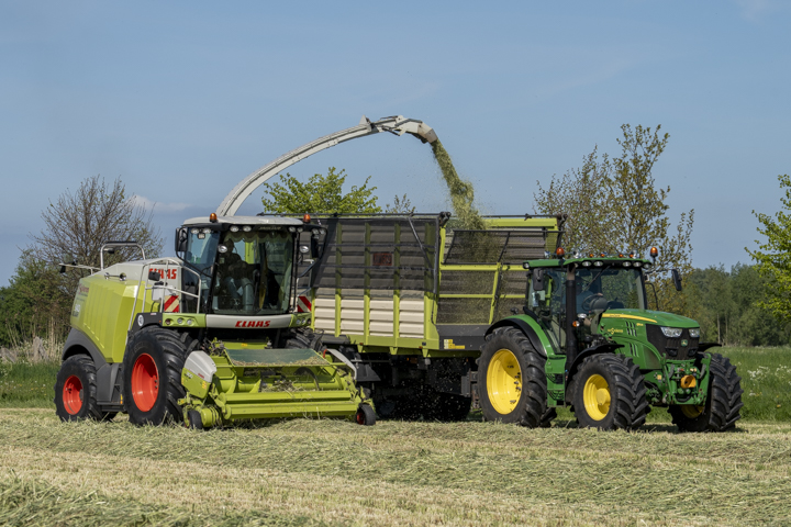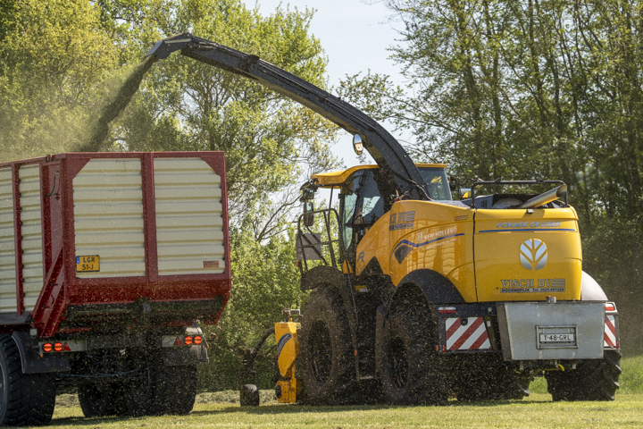 Terug in Flevoland stond ook daar gras op het menu. We zien loonbedrijf Visch met hun gloednieuwe New Holland hakselaar voor het eerst bezig dit seizoen. Ook collega-loonwerker Van Spijkeren was druk met hun Claas Jaguar en hakselploeg.