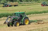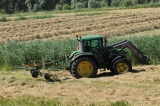 De JD 6110 van Den Hollander is nu met een Stoll hark bezig.