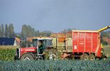 Blauw en geel materiaal in de vorm van New Holland aan het werk voor loonwerker Jan Bevers uit Loenhout. Het betrefd een NH FR 9060 hakselaar en NH TVT met een drie assige Peecon CARgo silagekipper.