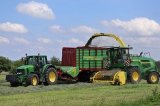 Een Claas Jaguar 960 en JD 6215R met Joskin Silospace 20-40.