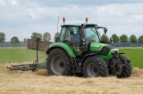 Een D-F Agrotron 6130.4 TTV met D-F Swatmaster 3821 harkt het bij elkaar.