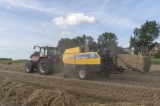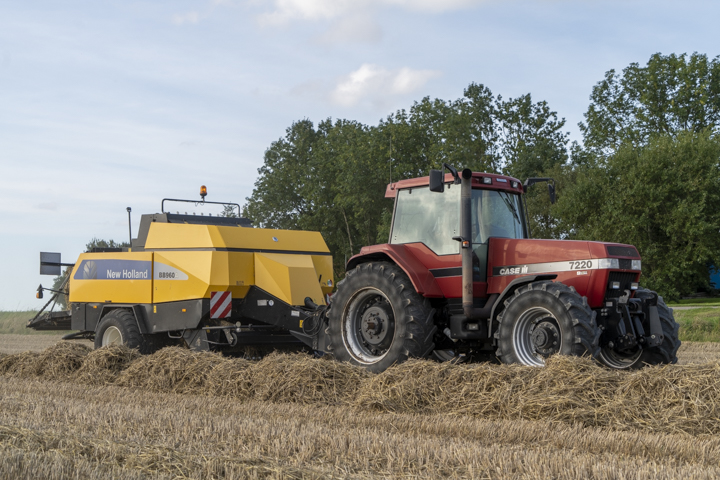 Akkerbouwbedrijf Peter Smith uit Bunde is stro aan het persen op het aangrenzende perceel.