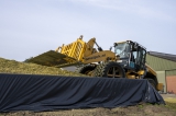 Op de achtergrond de hakselploeg en op de voorgrond de kuil waar een Cat 938M shovel met silagevork het werk doet.