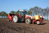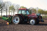 Case IH Maxxum 5150 met een Gaspardo granulaatstrooier en Hassia pootmachine van loonbedrijf Otten uit Emmen.