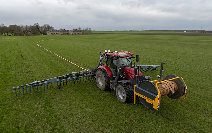 Zij gebruiken een Bomech sleepvoetbemester achter een Case IH Maxxum 150. In de fronthef een Tjalma slangenhaspel.