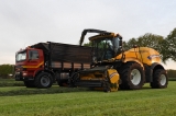 Een New Holland FR550 en ernaast een Ginaf agrotruck.