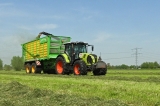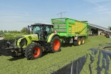 Claas Axion 850 met Bos silagevork en Holaras kuilverdeler.