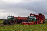 Een Fendt 718 Vario S4 met WKM ontbladeraar en Grimme Rootster 604.