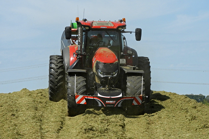 Case IH Optum 270 CVX met Holaras kuilverdeler en verdichtingswals.