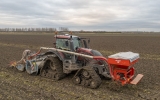 Er werd direct gespit en tarwe gezaaid door deze Valtra T234 op Soucy tracks. Voorin een Kuhn Venta TF 702 fronttank en achter een Imants roterende spitmachine, Rabe Werk rotorkopeg en Alpego kouterbalk.