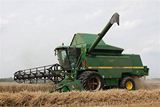 Tarwe dorsen met een JD 2266Extra met 825 maaibord van loon- en grondverzetbedrijf H. van Oosten uit Meeden.