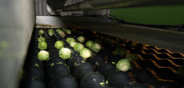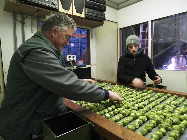 De tot nu toe nog steeds goedgekeurde spruiten belanden vervolgens in de sorteerkamer. Daar komen zij op een rolband terecht en worden de laatste onregelmatigheden met de hand eruit gehaald.