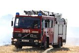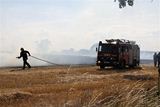 Even verderop blijkt een heel perceel gerststoppel in brand te staan. Een Manitou verreiker is druk bezig de pakken stro in veiligheid te brengen.