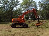 Daewoo 140 WV mobiele kraan van loonbedrijf Folkers uit Sellingen is bezig gras op te laden.