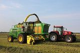 De John Deere 7400 hakselaar, met een 630A pick-up, en Case IH CVX 150 met een Joskin Silospace 22/45 silagewagen.