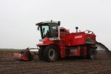 Bieten rooien door een Fendt Farmer 409 Vario met een bijzondere drie rijige Amac bietenrooier en loofklapper. Ernaast rijdt een Fendt Farmer 308C met Miedema kipper.