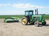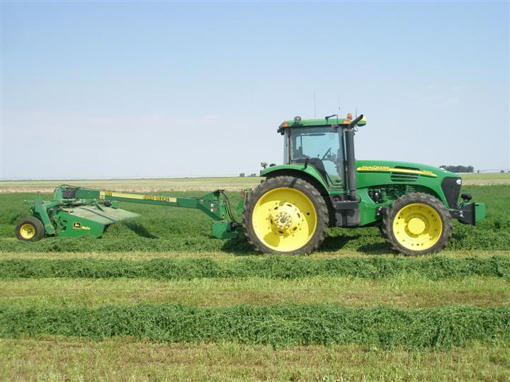 JD 7920 met 945 MoCo maaier bezig in een gewas luzerne.