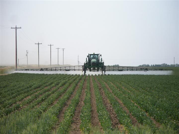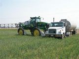 Vullen van de JD 4720 veldspuit om een gewas veldbonen te gaan spuiten.