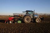 NH TS110A met schuif voorop en TerrAnovA kopeg met Kongskilde Demeter Classic 3000 zaaimachine achterop van de fam. Dekker uit Mijnsherenland zomertarwe aan het zaaien.
