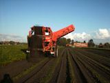 Het gaat hier om twee Dewulf RS 3060 rooiers. Deze hebben aan één kant wielen en de andere kant een rupsband. Het afvoeren van de wortels gebeurde met een New Holland T70.0 met drie assige Dezeure hooglosser en een tweede NH met haakarm carrier (niet op de foto) van loonbedrijf Houthoofd Koenraad uit Ardooie.