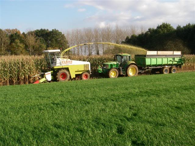 Inbreken van een perceel maïs. Achter de hakselaar rijdt een John Deere 6920 met Record kieper. Er is zelf een opzetschot op gebouwd voor het aanmaaien.