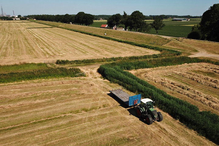 Loonbedrijf Jos Monden uit Etten-Leur harkt een snede gras bij elkaar.