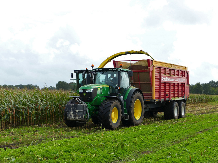 En een JD 7480i ProDrive hakselaar met 360Plus bek.
