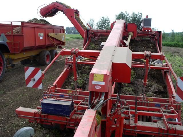 Biologische aardappels rooien door loonbedrijf Klootwijk uit Strijen met een Fendt 716 en Grimme GV 3000, 4 rijige wagenrooier.