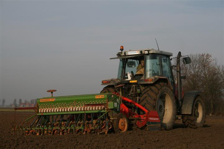 En nog enkele foto's van het landwerk op 29 januari. Hier een Massey Ferguson 6255 met Vogel & Noot rotorkopeg en Amazone D7 Typ 30 zaaimachine van akkerbouwbedrijf van Marion uit Zuidland bezig zomertarwe te zaaien.