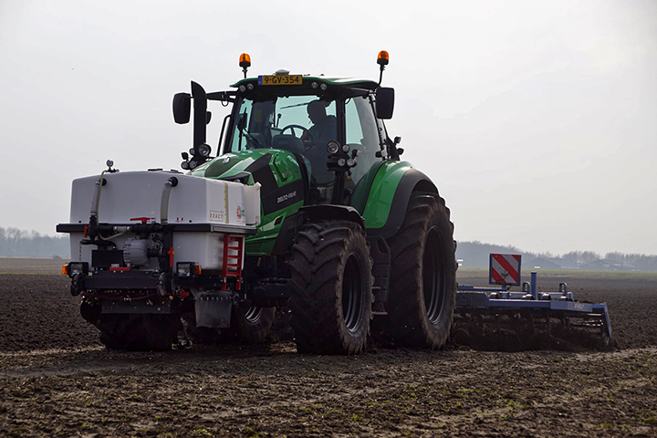 Deutz-Fahr Agrotron 6215 TTV met MB-Techniek Exact fronttank en ZEI Beckmann-Vollmer T-Rex triltandcultivator van Siebring Akkerbouw uit Oranjedorp.