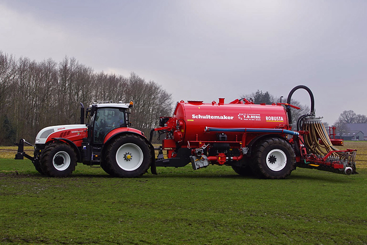 Steyr 6220 CVT met Schuitemaker Robusta mesttank en Exacta zodebemester van loonbedrijf Van de Berg uit Wapse.