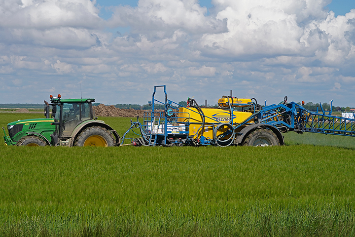 Wintergerst spuiten door Van Liere Landbouw uit Dronten/Swifterbant met een John Deere 6150R en Delvano 4400 PS veldspuit.