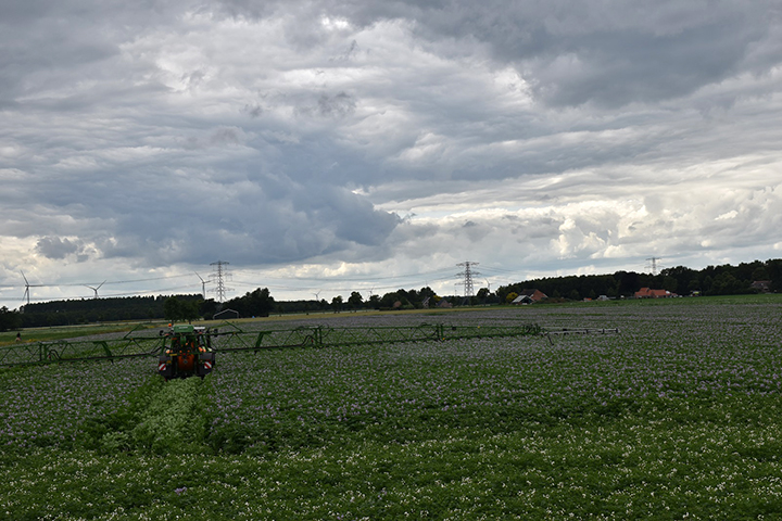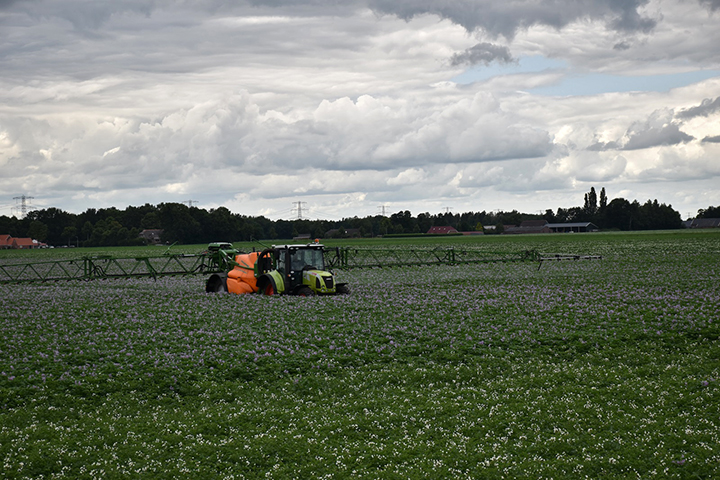 Nadat er gecombined is moet natuurlijk ook het stro nog worden geperst. Herman fotografeerde de mooie JD 7710 met Krone pers van Dylan Reij aan het werk. Daarnaast zien we ook nog 2 spuitcombinaties die bezig waren in de aardappelen.