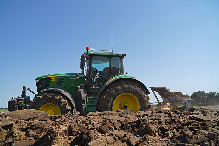 Het ploegen werd gedaan door loonbedrijf Van de Put uit Oosterwolde met een JD 6215R. Erachter hangt een Panter diepploeg van Lodders Landbouw.