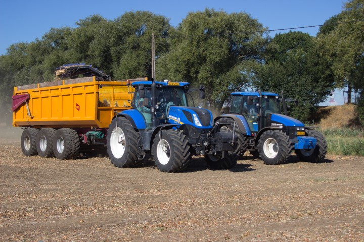 Opladen van de uien door JS Agro uit Ossendrecht met hun New Holland TS 115 en SU-Tech enkelzwad lader. Ernaast de New Holland T7.230 met 3-assige BKH kieper.