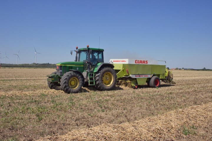 Biopolder uit Berendrecht zijn echte John Deere fans. Hier de John Deere 6155R met strowagen en John Deere 6420 met 653 voorlader.