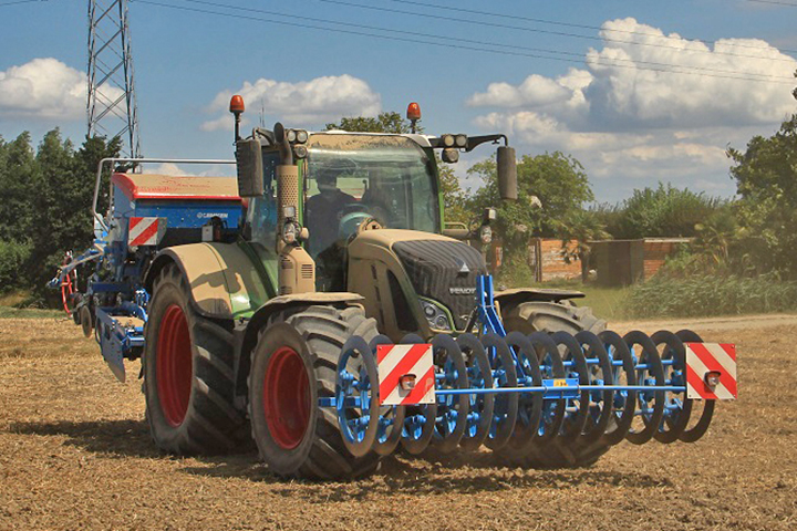 Achter de stofwolken gaat een tweede Fendt 724 gehuld met voorin een Lemken VarioPack pakkerwals en achter een Lemken Zirkon kopeg en Saphir 7 zaaimachine.