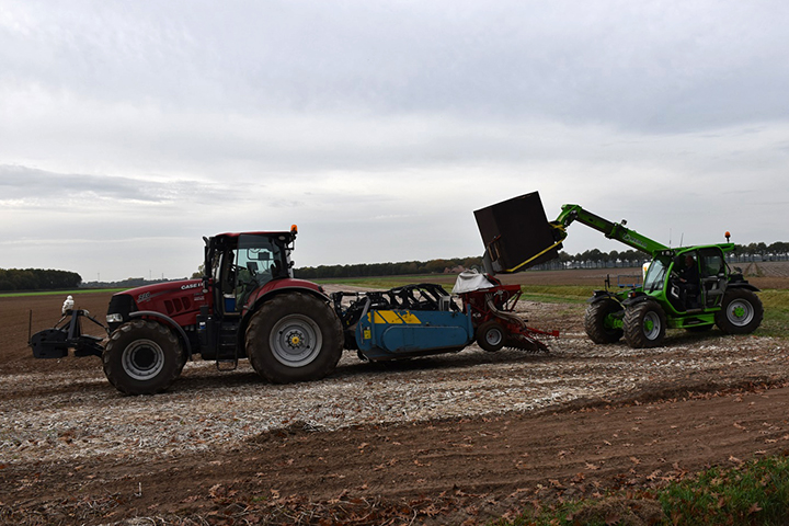 Na de oogst resteert nog genoeg ander werk. Daar zien we in deze serie meer van. Walkantfrezen, spitten en graan zaaien maar ook het afdekken van de hopen met zetmeelaardappelen die deze winter afgeleverd moeten worden.
