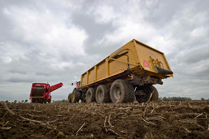 Aardappeloogst door loonbedrijf Buysse uit Zelzate. Voor de afvoer een Valtra T4-serie met Record dumper.