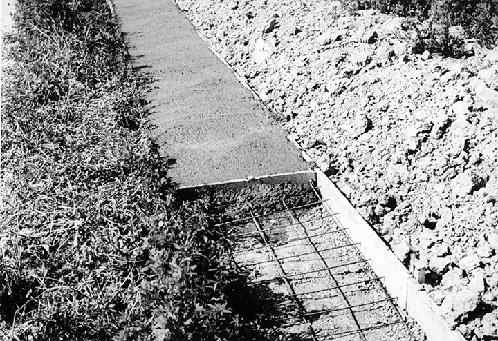 In stille tijden kunnen prima betonpaden worden aangelegd om het transport te verbeteren, zo oordeelt de redactie. Hier 12cm dikke rijbanen van 65cm breedte in wording, tussen een bekisting.