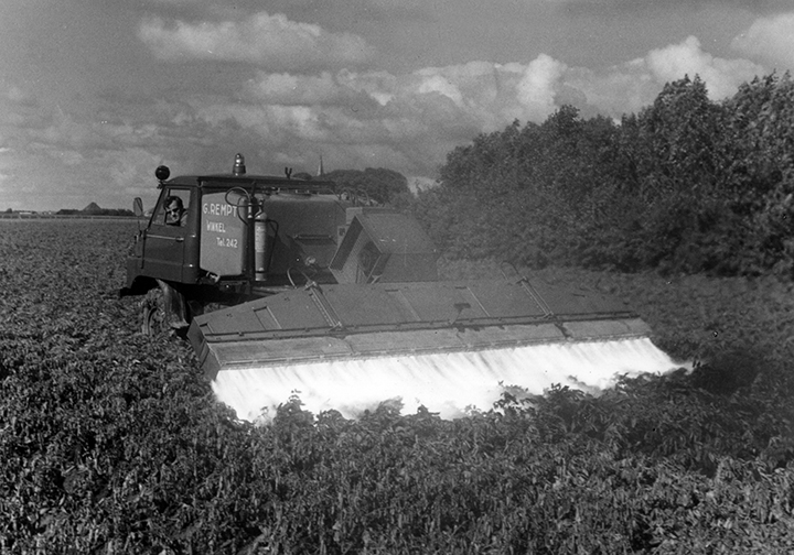 In 1969 werden voor het eerst in Nederland op enige schaal pootaardappelen doodgebrand in plaats van doodgespoten. De resultaten werden met argusogen gevolgd. Hier de Blaak loofbrander op een Unimog. In totaal zijn er 20 van deze loofbranders in gebruik gebouwd door machinefabriek De Blaak.