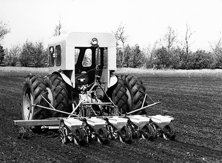 Een zesrijige precisiezaaimachine achter een zware trekker met brede banden (Fordson Dexta) die met brede banden in de losse grond veel sporen maakt.