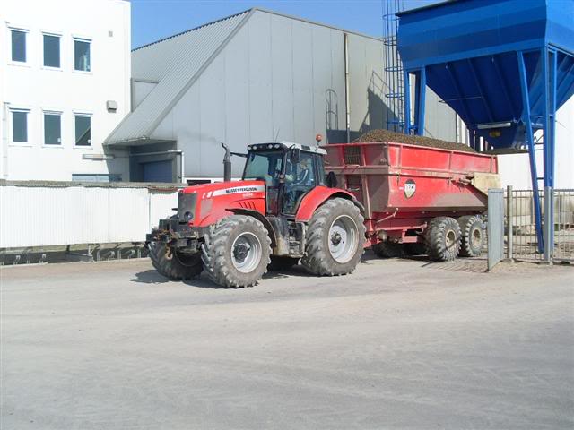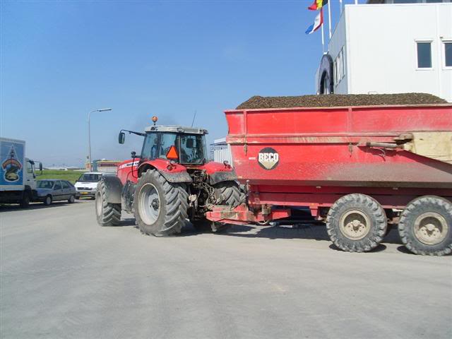Loonbedrijf Paauwe uit Yerseke gebruikt deze Massey Ferguson 6495 samen met een Beco tandemas kipper in de haven van Yerseke waar een schip met 700 ton schelpen gelost moet worden in enkele uren.