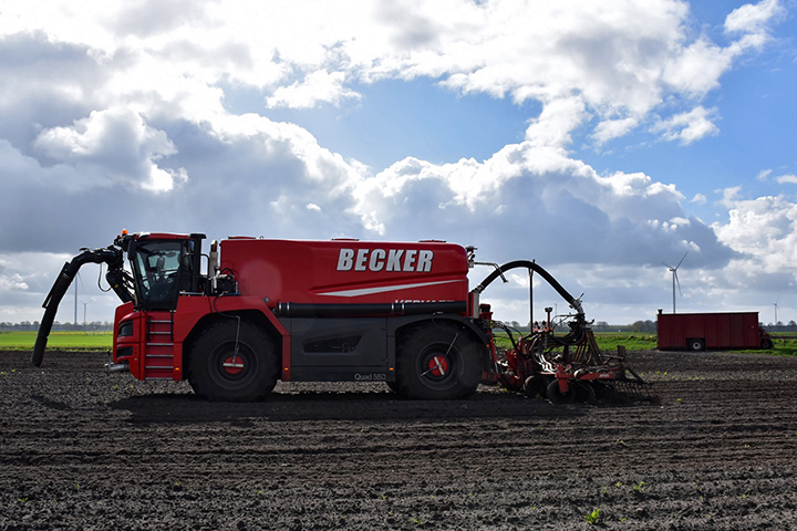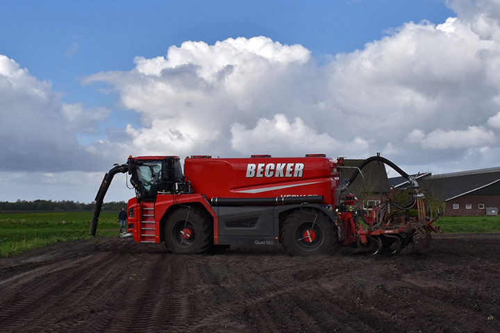 Het is toch opnieuw mest wat de klok slaat. Begin april waren loonwerkers allemaal druk op de droge percelen. We zien loonbedrijf Becker met hun Vervaet Quad, Kees de Gier met een nieuwe Valtra Q305 en loonbedrijf Mennega aan het mest strooien.