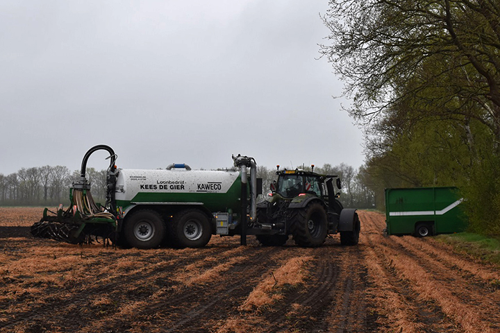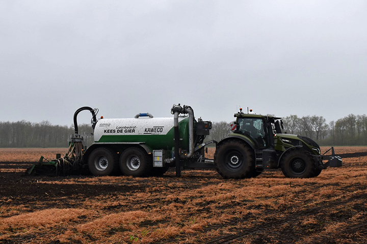 Valtra Q305 met Kaweco Profi II.12 mesttank en bouwlandbemester van loonbedrijf Kees de Gier uit Bovensmilde.