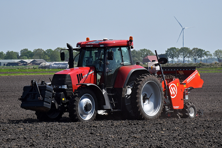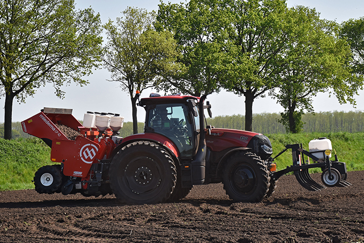 Case IH Maxxum 150 CVXDrive met frontcultivator en Miedema CP 42 pootmachine van landbouw- & loonbedrijf Zuidema Plagge uit Onstwedde.