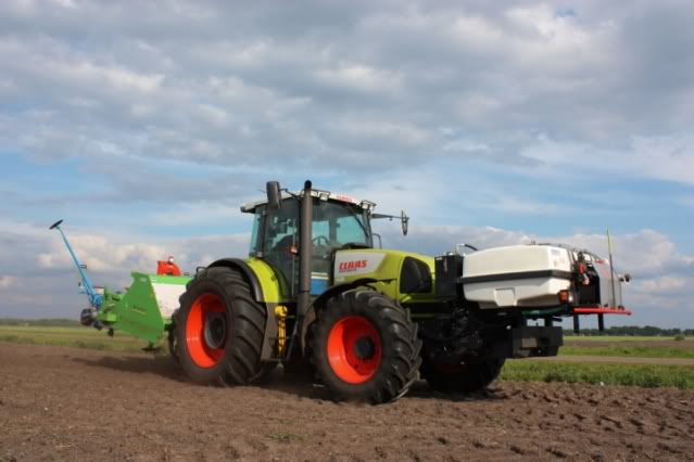 Spitten en maïs zaaien in één werkgang met een Claas Ares 826rz met MBT Exact fronttank voor vloeibare kunstmest, Farmtec spitmachine en Monosem vier rijige zaaimachine.